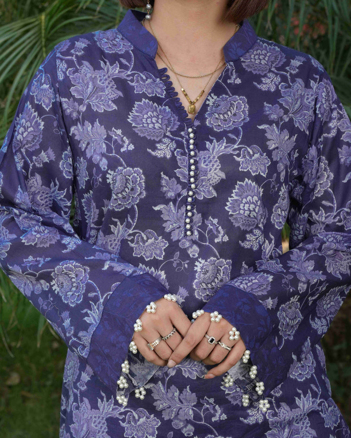 Color: Deep indigo blue base adorned with soft lilac and periwinkle floral patterns, creating a serene and graceful look.
