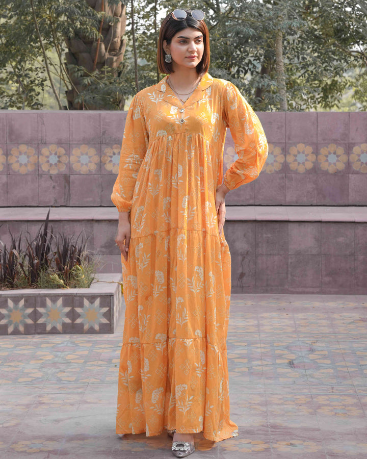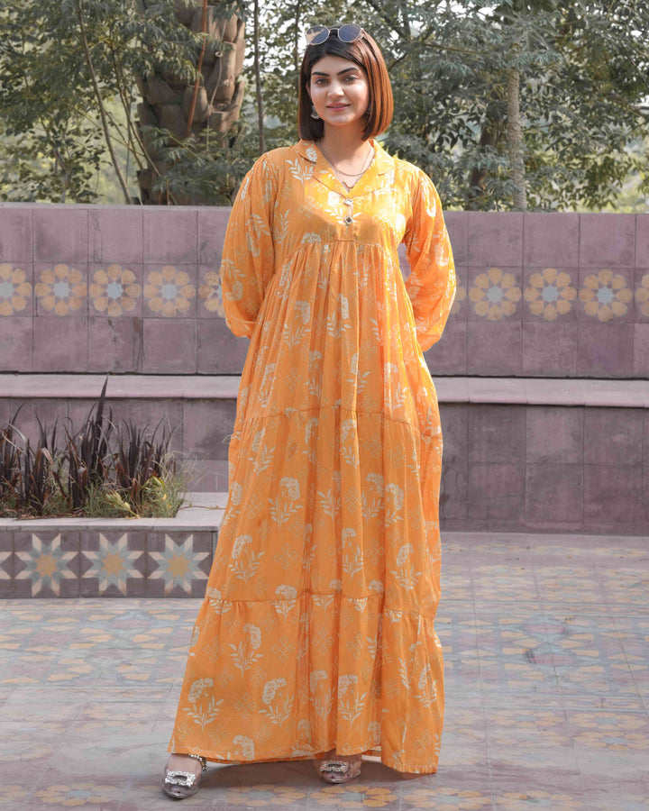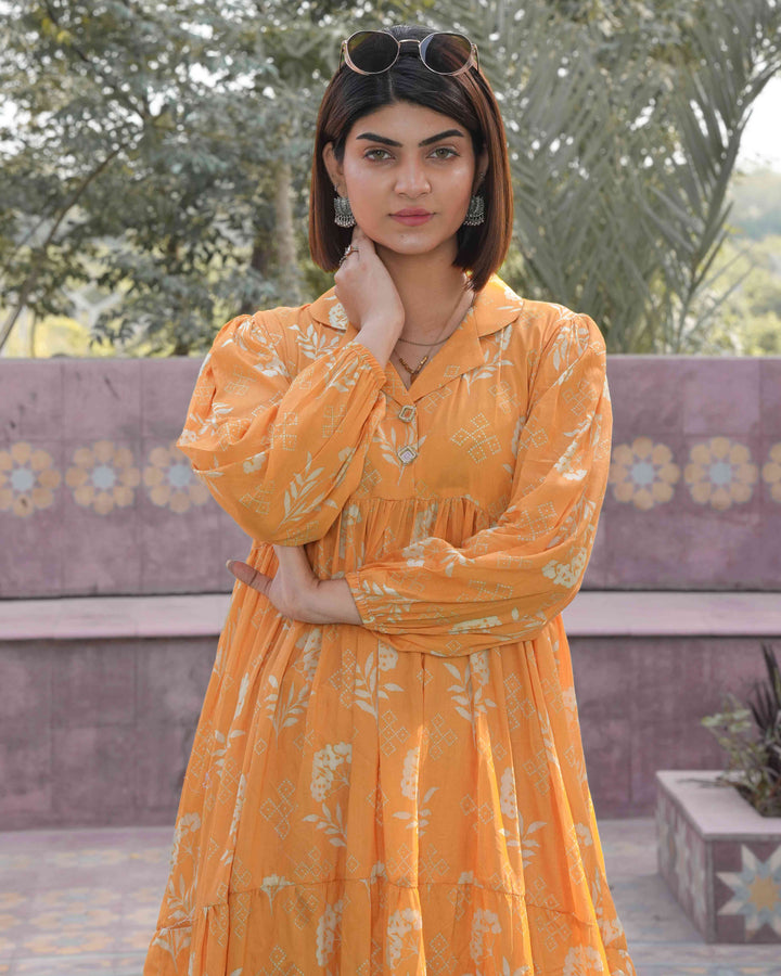 Color: A radiant marigold yellow forms the base of this ensemble, bringing a sense of sunshine and joy to your wardrobe. The print is delicately rendered in soft ivory, offering a subtle and sophisticated contrast.