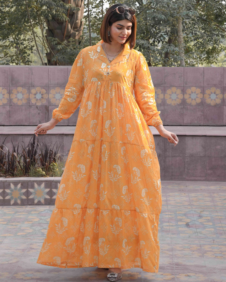 Design: This flowing maxi-style kurta features an all-over floral and geometric print that exudes feminine charm. The relaxed, tiered silhouette adds graceful volume and fluidity to every step, making it ideal for casual elegance.